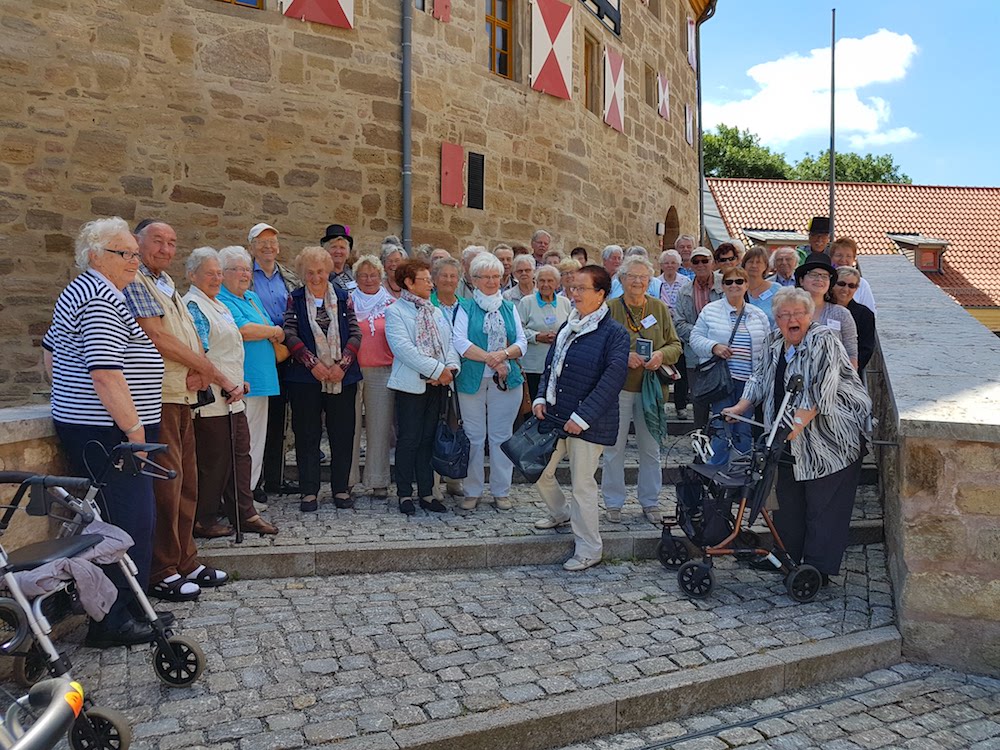 Nach erstem Kennenlernen empfing uns auf der Burg Scharfenstein Frau Lagemann zu einer interessanten Führung: Eine Burg in der Entwicklung aus der alten Zeit in die Neuzeit. Anschließend genossen wir den Weitblick der Terrasse und nahmen eine Thüringer Mittagsmahlzeit ein. Von dort fuhren wir zur Gedenkkapelle von Etzelsbach. Die Gerblingeröder Frauen sangen zu Ehren der Muttergottes das „Gegrüßet seist du Maria“ und wir genossen die Ruhe dieses Ortes.