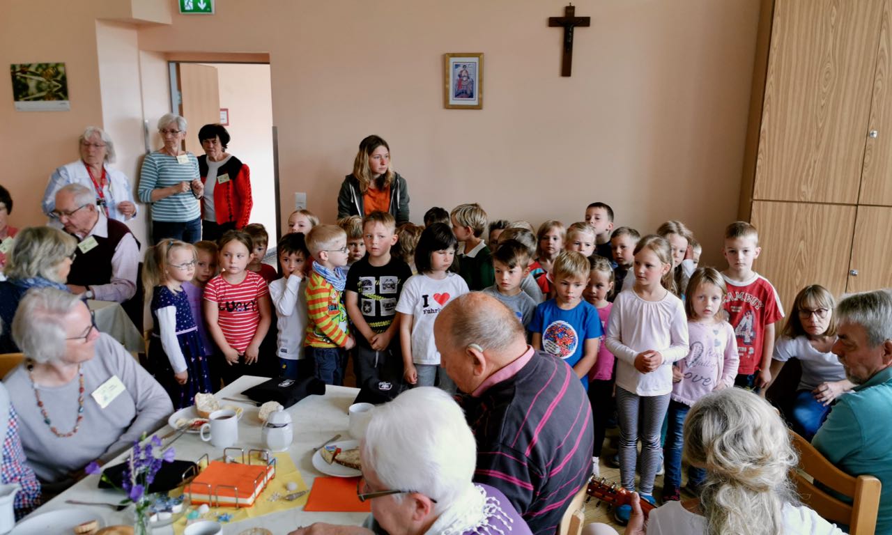 Nach dem Frühstück am ersten Urlaubstag kamen kleine Überraschungsgäste des Inge-Sielmann-Kindergartens mit Tanz und munterem Liedgut, um die Senioren willkommen zu heißen. Nach 10 Uhr machte sich die Reisegruppe durch eine wunderschöne Landschaft auf in Richtung Germershausen, um dort am 2. Wallfahrtstag den Reisesegen zu empfangen.