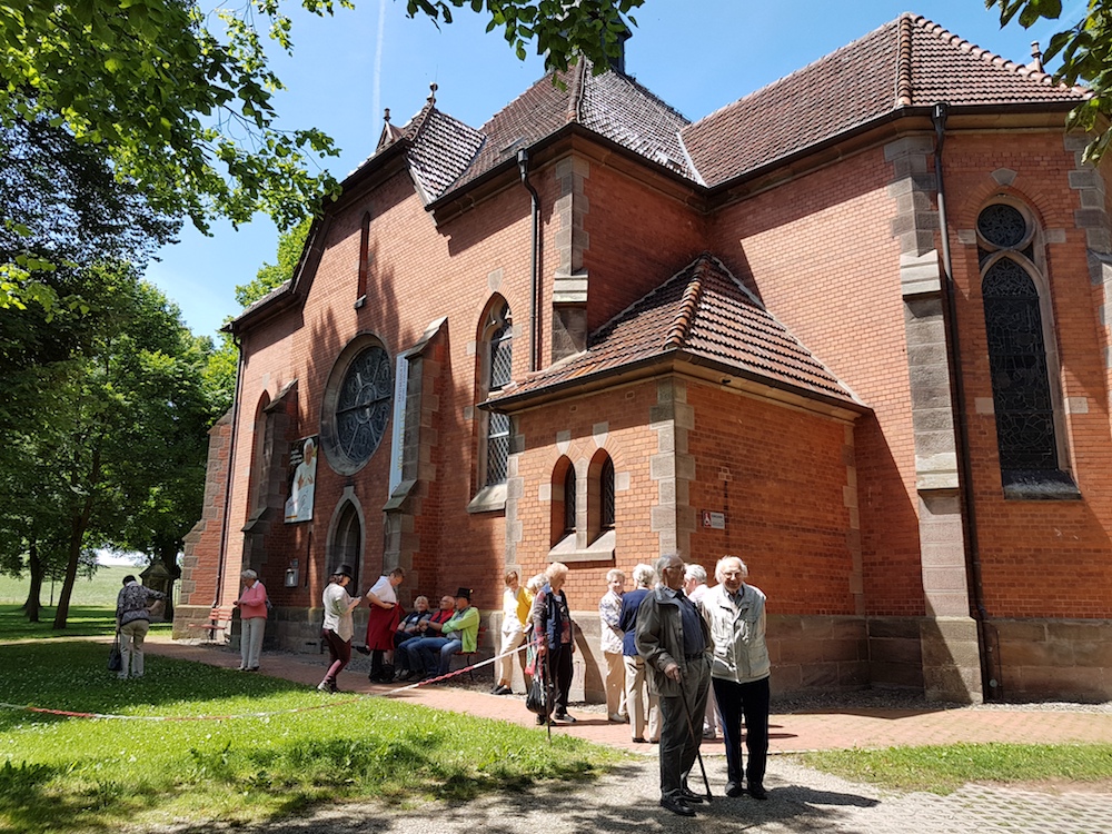 Nach erstem Kennenlernen empfing uns auf der Burg Scharfenstein Frau Lagemann zu einer interessanten Führung: Eine Burg in der Entwicklung aus der alten Zeit in die Neuzeit. Anschließend genossen wir den Weitblick der Terrasse und nahmen eine Thüringer Mittagsmahlzeit ein. Von dort fuhren wir zur Gedenkkapelle von Etzelsbach. Die Gerblingeröder Frauen sangen zu Ehren der Muttergottes das „Gegrüßet seist du Maria“ und wir genossen die Ruhe dieses Ortes.